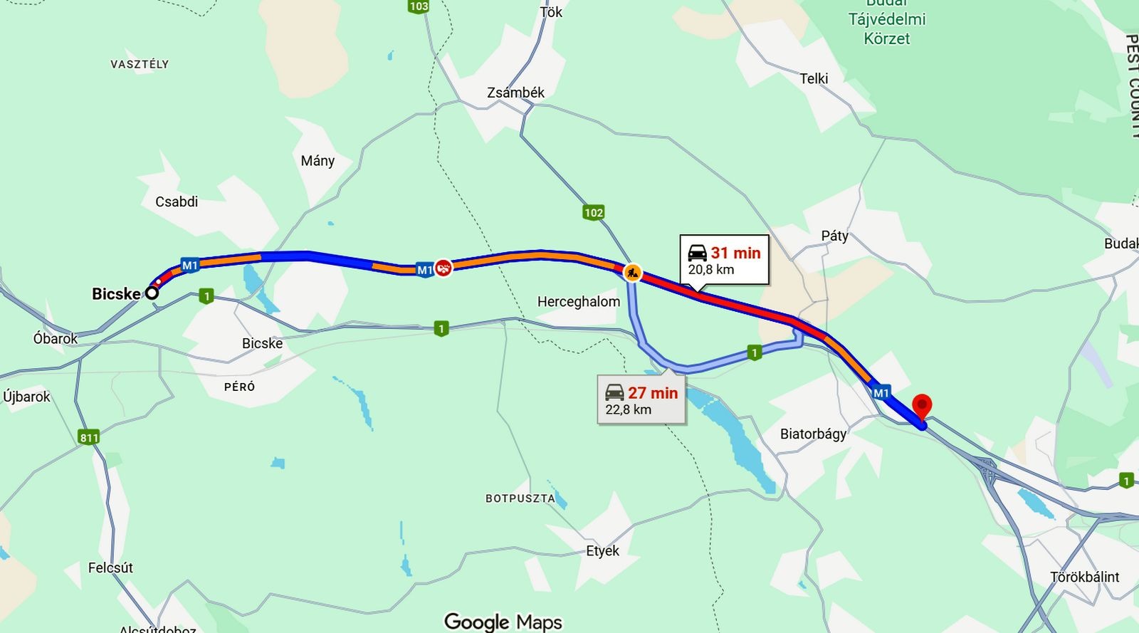 Az M1 bővítése miatt jelenleg számos helyen komplikált ideiglenes forgalmi rend érvényesül az autópályán. Az egyik ilyen szakaszt látjuk problémásnak. A bicskei (39-es) felhajtótól Budapest felé egészen Biatorbágyig, kb. 20 kilométeren át, két benzinkút mellett is elhaladva úgy oldotta meg a terelést az útkezelő, hogy a "külső", tehát a Bp. felé bal oldali útpályán futó sáv és a "belső" sáv (ami most az Ausztria felé futó pálya belső sávja) között nincs átjárási lehetőség. Ez egyrészt kellemetlen lehet a "belső", tehát a szemközti pályára átterelt forgalom számára, hiszen ők ezen a viszonylag hosszú szakaszon nem tudnak kiállni, ha a szükség úgy hozná, de kellemetlen a "külső" sávon haladó gyorsabb járművek (elsősorban személyautók) számára is, mert ők kiszorulnak ebbe a lassabb, csúcsidőben vánszorgó sávba, nem tudnak besorolni a gyorsabb "belső" sávba. Praktikusan a bicskei illetve a pátyi térségben élők, az M1-re itt felhajtók, fővárosi ingázók számára teszi nehezen tervezhetővé az utazást, hogy beszorulnak a kamionsorba.