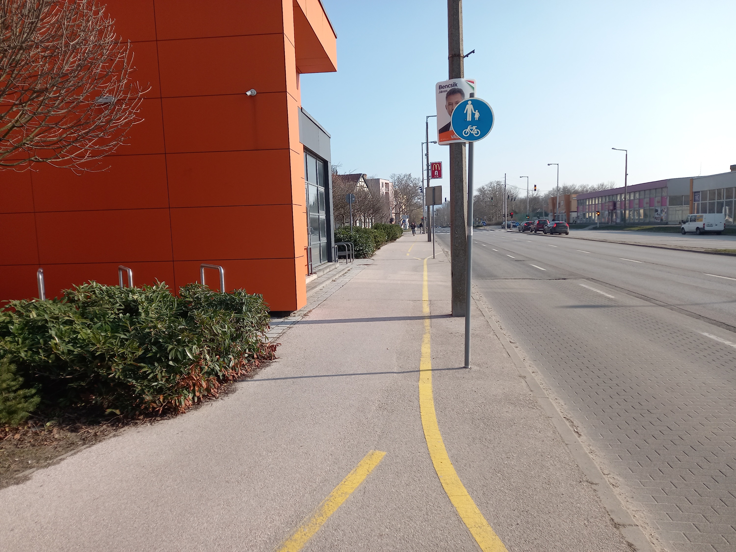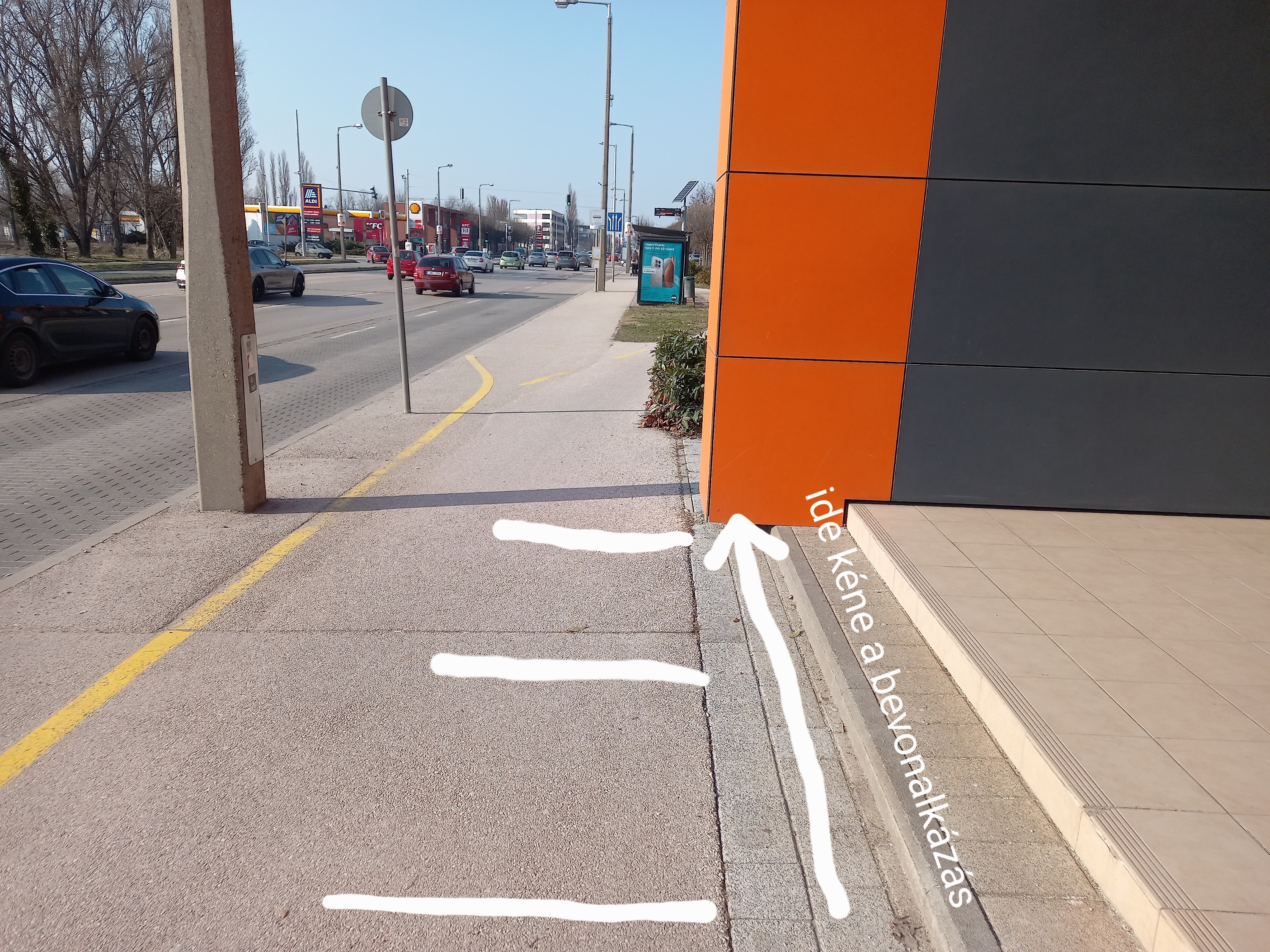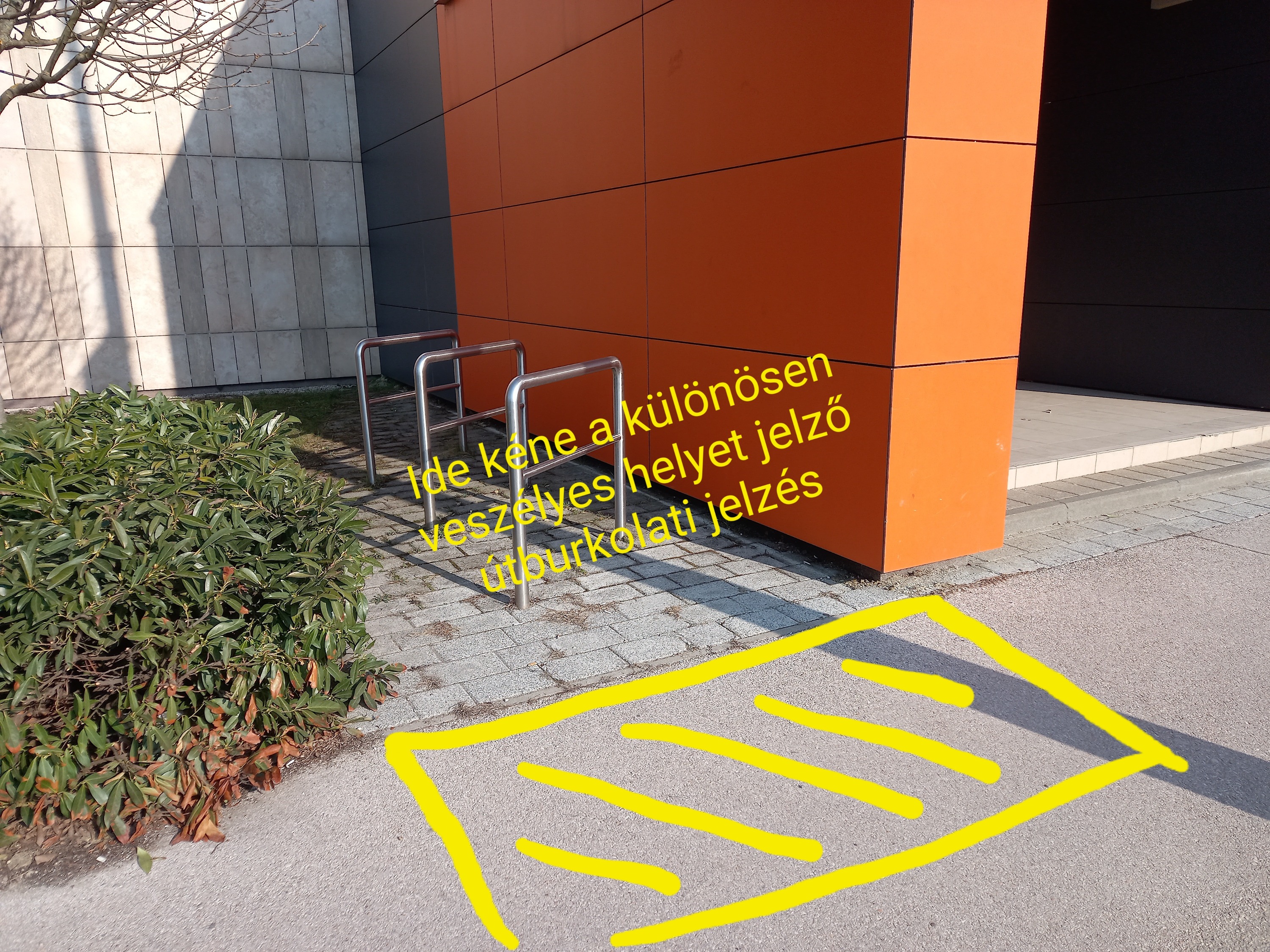 - Őszintén szólva, mi ez nem érezzük ekkora problémának, hogy sárga sraffozással és még sebességkorlátozással is terheljük a "fő" út forgalmát. Érzésre, innen, a tároló felől nem lehet nagyon gyorsan kilendülni, mert nincs hely hozzá, ráadásul még az útburkolat sem teszi lehetővé. De a sraffozós megoldást, mely a hely veszélyességére hívja fel a figyelmet (a meglehetősen rosszul kialakított kerékpártároló miatt), továbbítjuk az önkormányzatnak.