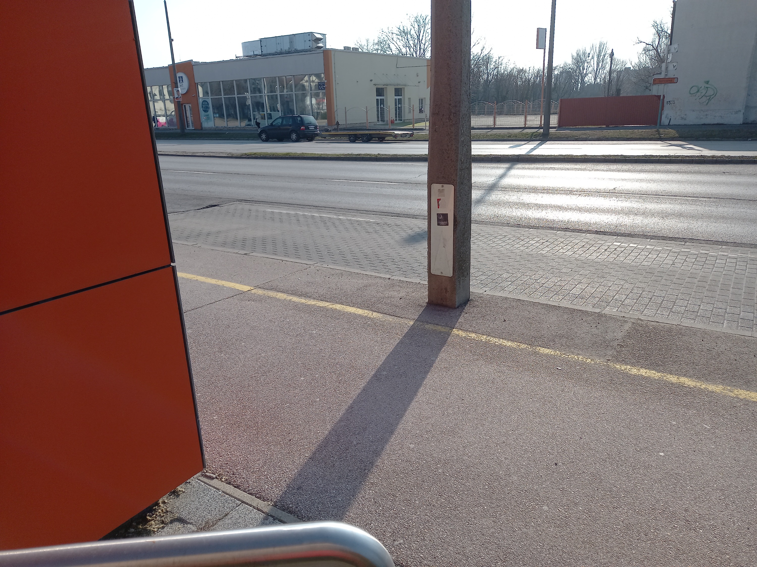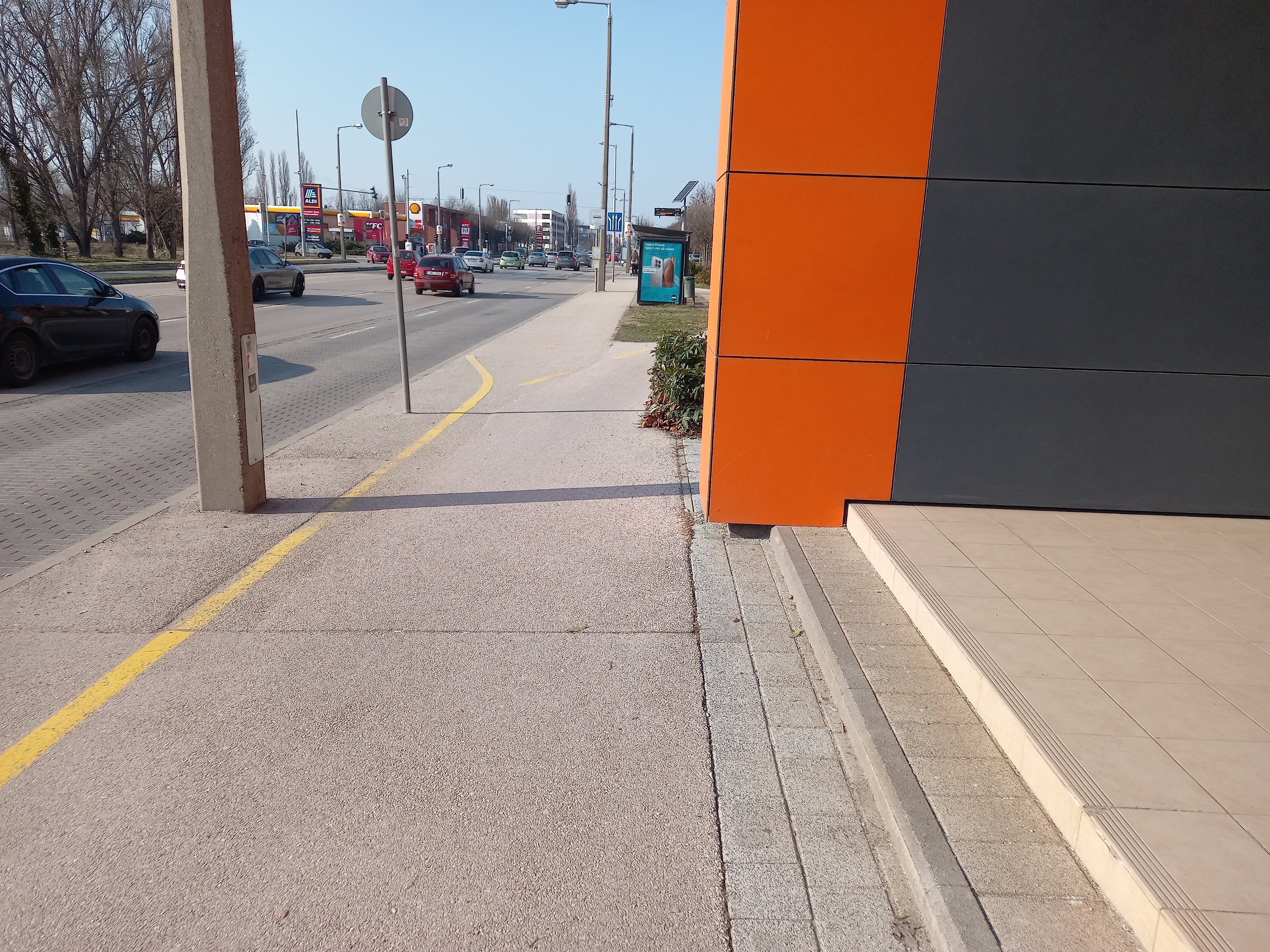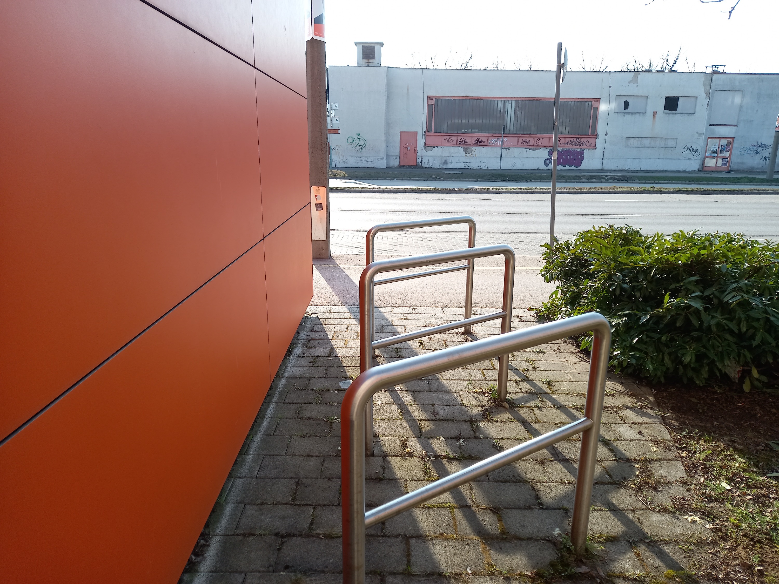 - Őszintén szólva, mi ez nem érezzük ekkora problémának, hogy sárga sraffozással és még sebességkorlátozással is terheljük a "fő" út forgalmát. Érzésre, innen, a tároló felől nem lehet nagyon gyorsan kilendülni, mert nincs hely hozzá, ráadásul még az útburkolat sem teszi lehetővé. De a sraffozós megoldást, mely a hely veszélyességére hívja fel a figyelmet (a meglehetősen rosszul kialakított kerékpártároló miatt), továbbítjuk az önkormányzatnak.