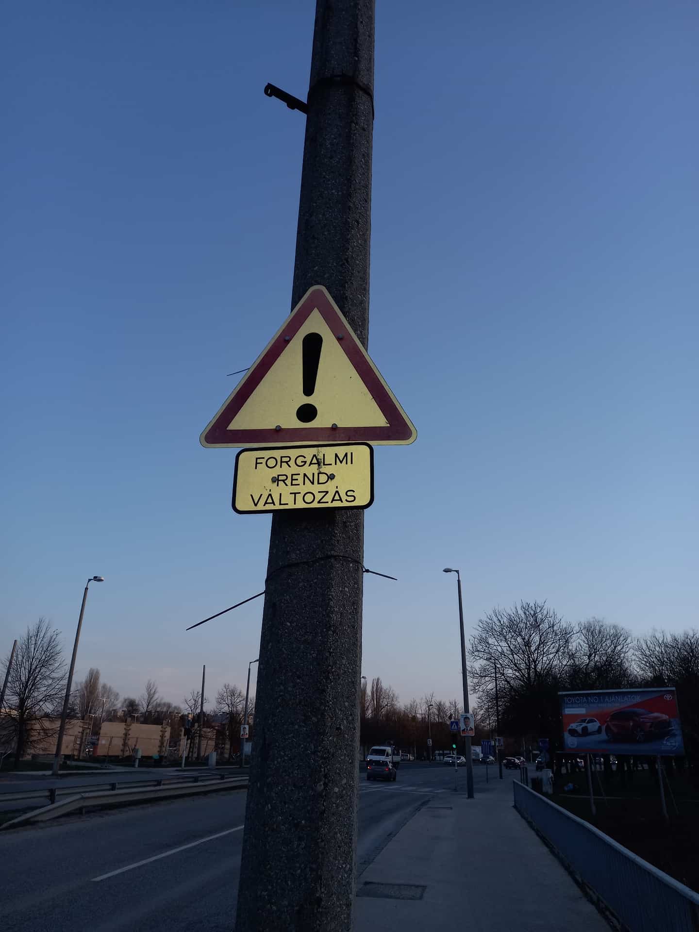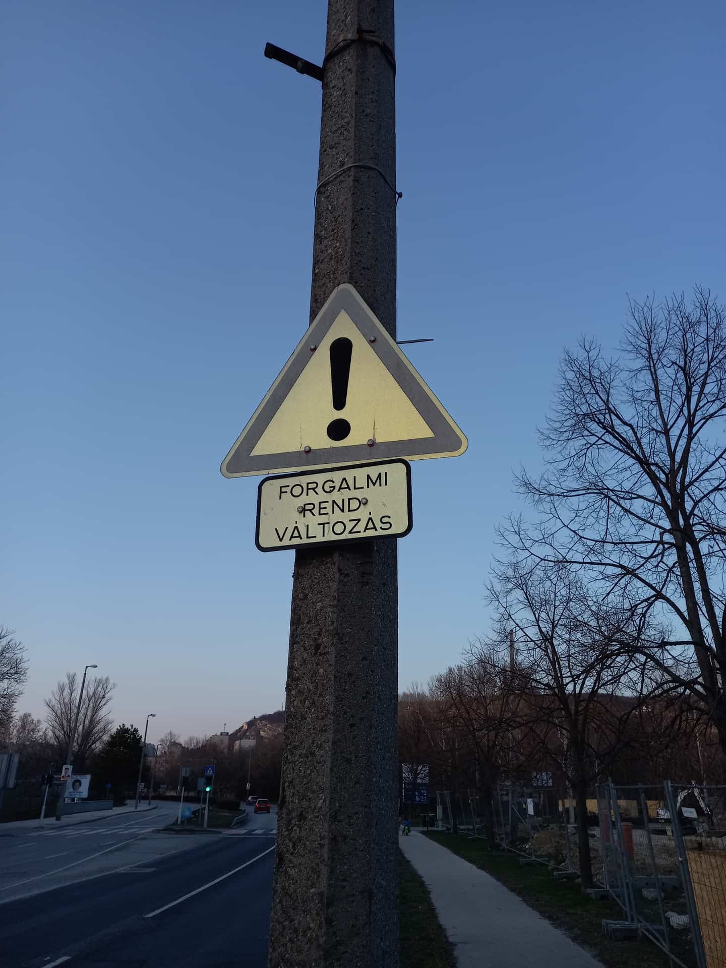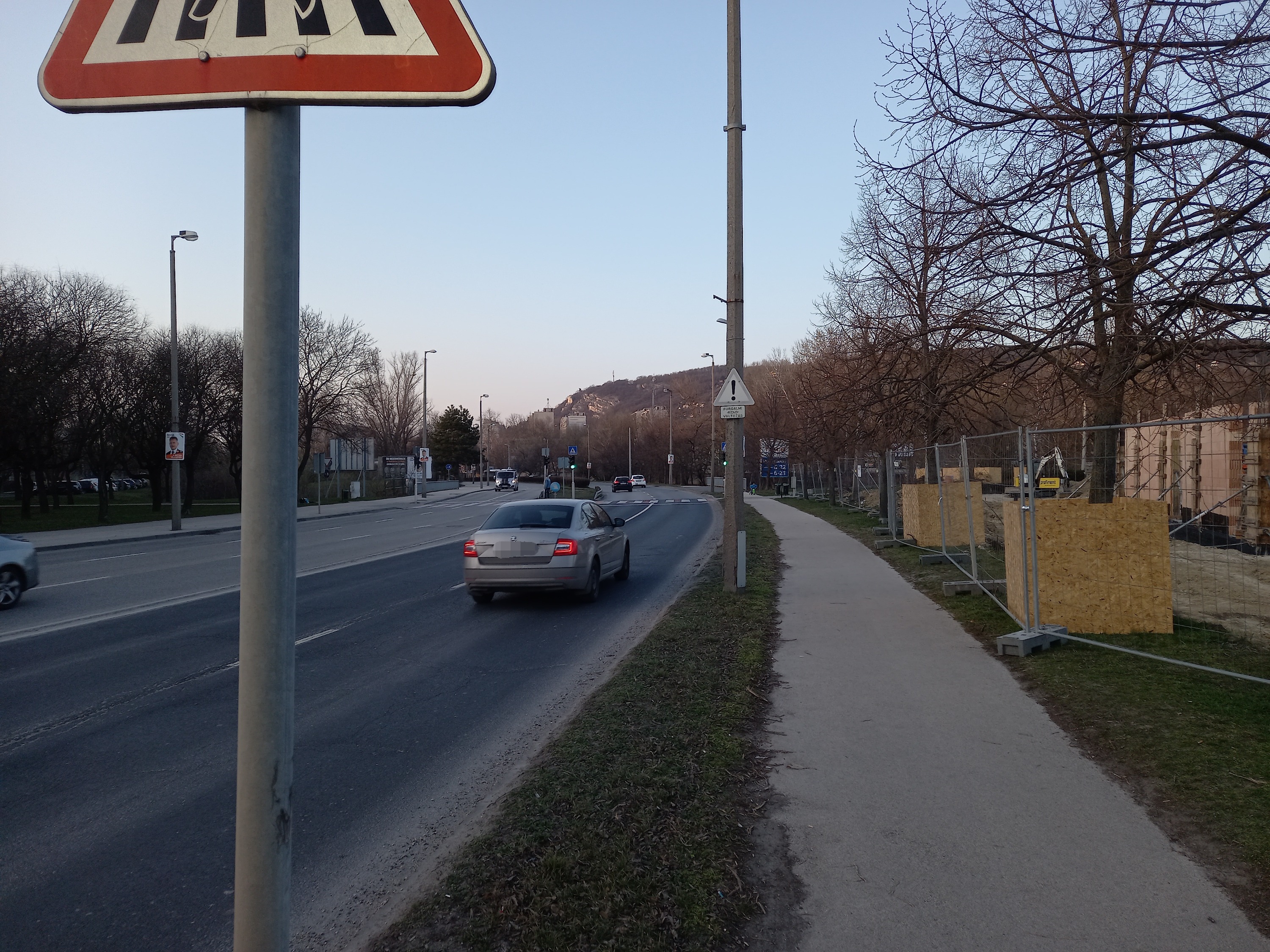 A tatabányai Tesco gyalogos megközelítése Sárberekből annó elég kacifántos volt. Bizonyára sokan nem mentek kerülő úton, hanem inkább keresztülmentek a négysávoson. Biztosan történt egy-két gázolás, amely miatt külön gyalogátkelőhelyet létesítettek, amely a fent említett két úticélt köti össze. A zebrát gyalogátkelőhely veszélyt jelző tábla mellett még forgalmi rend változás táblával is előjelezték. Azonban a forgalmi rend változás táblák azóta is, évek óta ugyanúgy kint vannak érintetlenül. Mostanra már igencsak el is koptak.